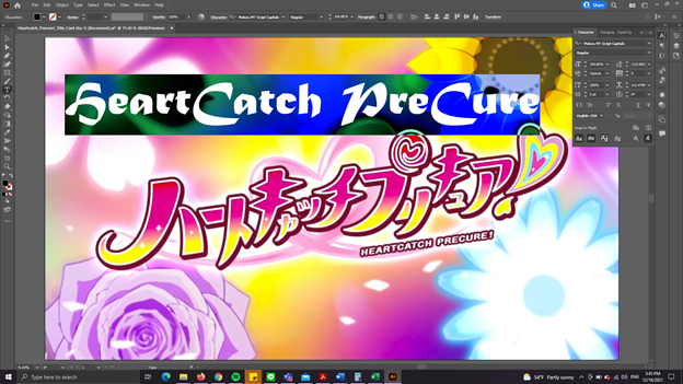 The Pretty Cure (or PreCure) franchise is an action and magical girl metaverse that has spanned 18 series in 18 years and has a much-dedicated fanbase. HeartCatch PreCure! is the seventh installment in the franchise and by far the best franchise series that developed a cult following. It was created by Izumi Todo and Bandai and produced by Toei Animation and Bandai. The show features two motifs based upon fashion and the language of flowers. HeartCatch PreCure! is also one of my all-time favorites in the Precure universe, so I was ecstatic to have the opportunity to recreate the title text for the English audience since the show has yet to come to America.